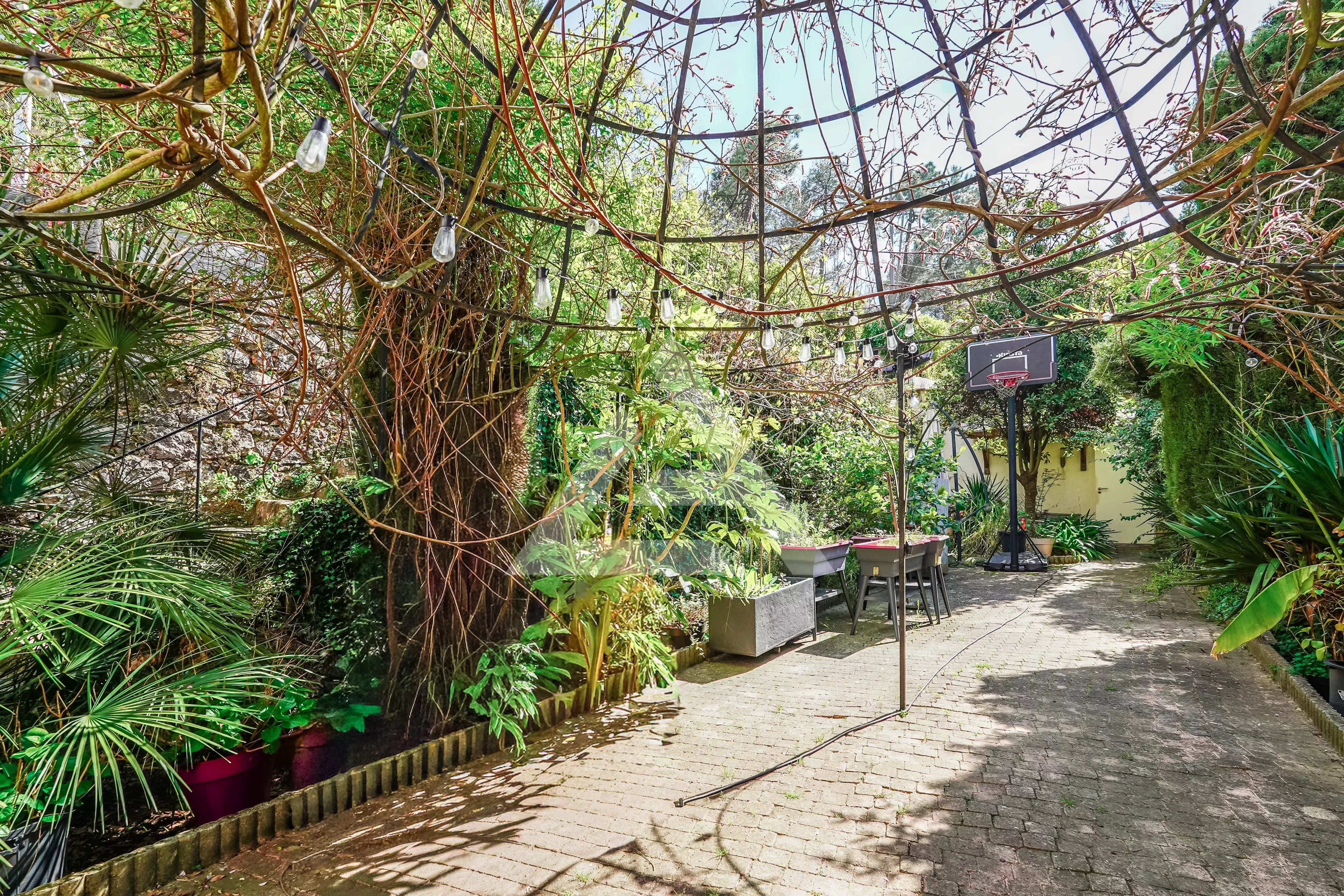 - Ground floor: a welcoming entrance hall, a dining room with a fireplace opening onto a spacious covered terrace, a fully fitted kitchen, a conservatory serving as a study, a living room with high ceilings, a mezzanine bedroom, a utility room and a shower room with a toilet.